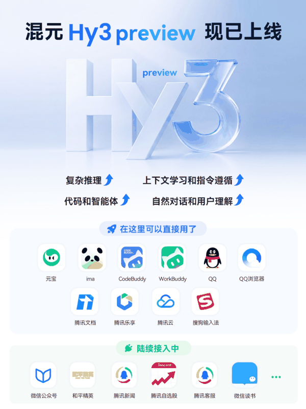 如今,混元Hy3 preview已在腾讯云、元宝、QQ、腾讯文档等首发上线,微信公众号、腾讯新闻等多个主线产品也在陆续上线,新的模型能力正在这些业务产品中生成案例,并加速迭代。