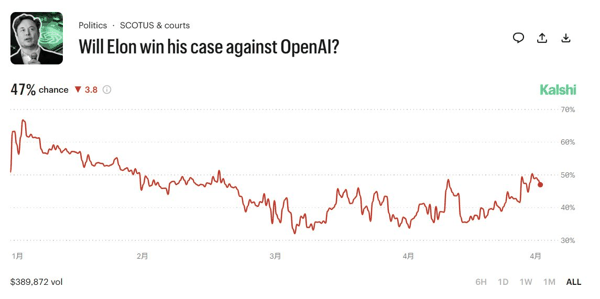 预测平台Kalshi数据显示,截至4月27日中午,马斯克胜诉概率已从1月中旬的67%回落至约47%,但不确定性本身已足以撬动市场预期。