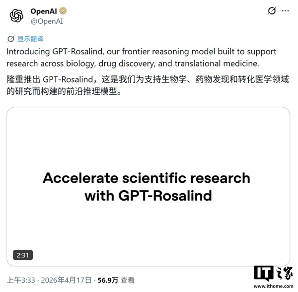 IT之家 4 月 17 日消息,OpenAI 周四宣布推出 GPT-Rosalind, 这是一款专为生物学工作流训练的大语言模型。 与谷歌、微软等科技巨头推出的通用科学模型不同, GPT-Rosalind 走垂直路线,专注于生物学领域。