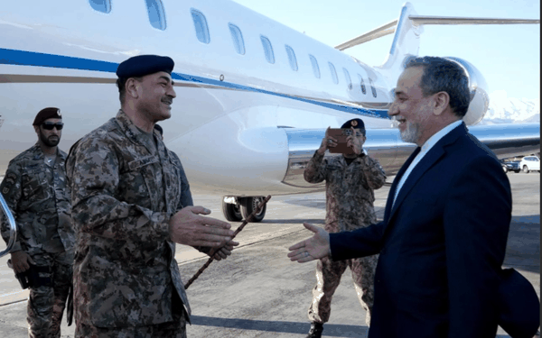 ▲当地时间2026年4月15日,伊朗德黑兰,由巴基斯坦陆军参谋长穆尼尔率领的代表团抵达德黑兰,继续推进斡旋美伊谈判,伊朗外长阿拉格齐迎接巴基斯坦代表团。图/IC photo