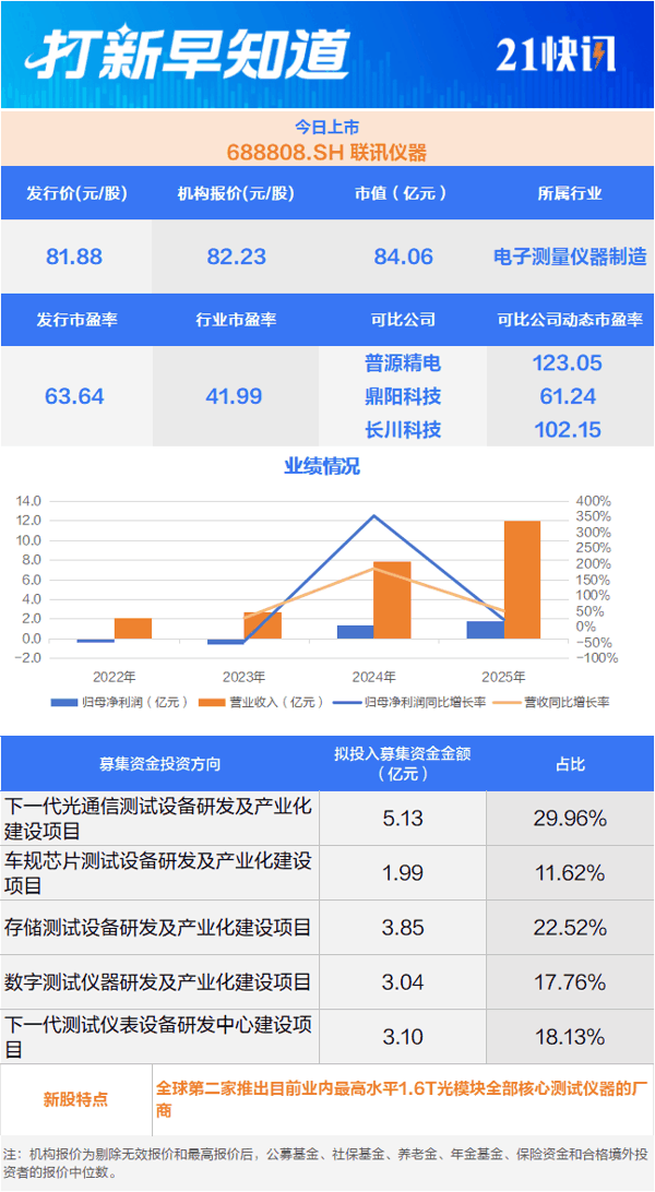 技术方面, 联讯仪器 是业内极少数覆盖光通信产业链中模块、芯片、晶圆等核心环节测试需求的厂商,全球少数、国内极少数量产供货400G、800G、1.6T高速光模块核心测试仪器的厂商,全球第二家推出目前业内最高水平1.6T光模块全部核心测试仪器的厂商;国内极少数可提供PXIe插卡式源表、低漏电开关矩阵、高压源表、脉冲源等多产品矩阵的电性能测试仪器厂商;国内极少数同时实现晶圆级老化测试设备、裸芯片级分选测试设备产业化应用的厂商,国内少数具备精密源表等核心测试部件自主能力的 半导体 测试设备厂商,产品核心性能指标业内领先。