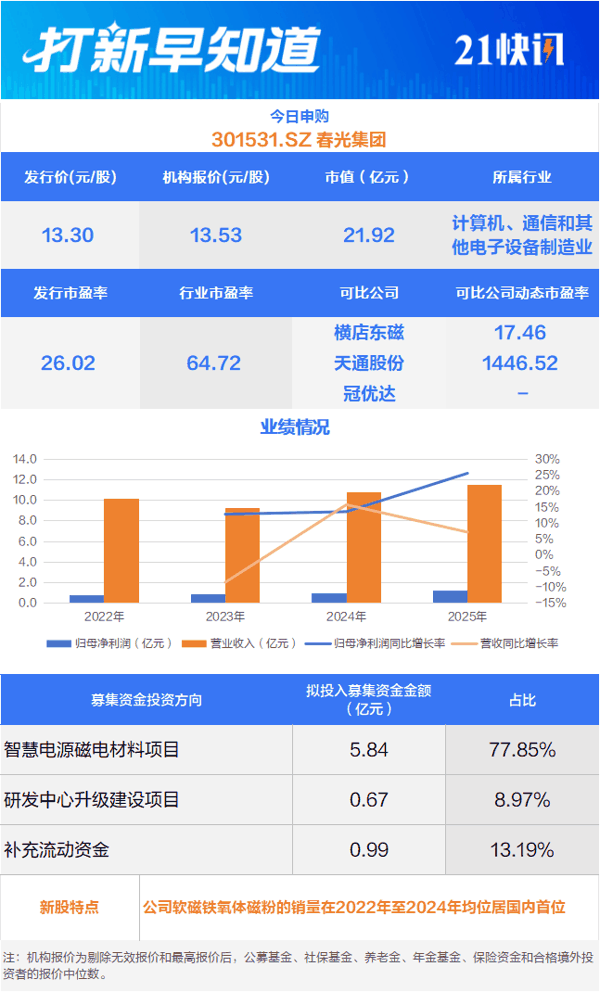 国内软磁铁氧体磁粉龙头今日申购另有2只新股上市丨打新早知道