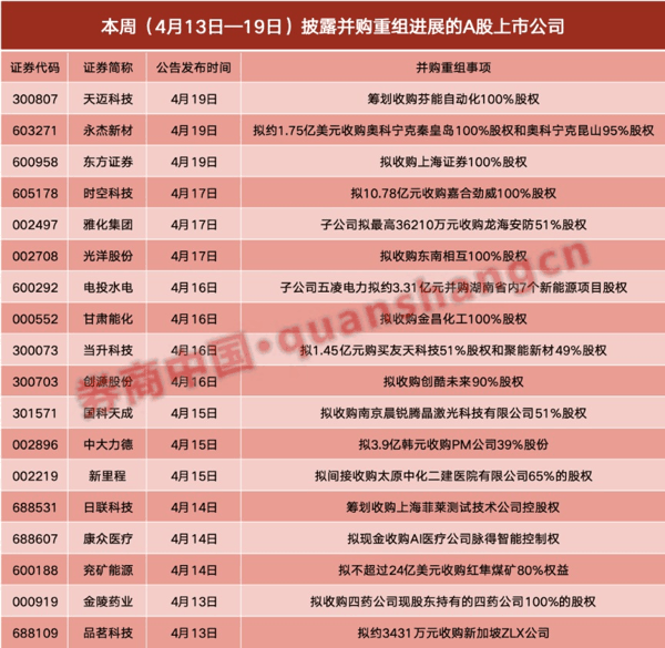 据不完全统计,截至发稿,本周(4月13日—19日)披露并购重组进展的A股上市公司共有18家,包括 天迈科技 、 永杰新材 、 东方证券 、 时空科技 、 雅化集团 、 光洋股份 、 电投水电 、 甘肃能化 、 当升科技 、 创源股份 、 国科天成 、 中大力德 、 新里程 、 日联科技 、 康众医疗 、 兖矿能源 、 金陵药业 、 品茗科技 。