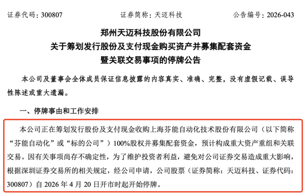 今日(4月19日), 天迈科技 发布公告称,公司正在筹划发行股份及支付现金收购上海芬能自动化技术股份有限公司(以下简称“芬能自动化”)100%股权并募集配套资金,预计构成重大资产重组,公司股票自4月20日起停牌。