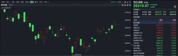 早间开盘,恒生指数开盘报26210.97点,下跌183.29点,跌幅0.69%。
