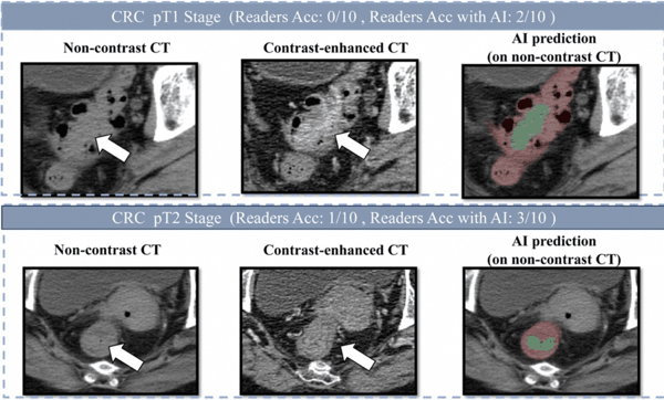 肠癌病灶在平扫CT、增强CT和AI画面上的表现