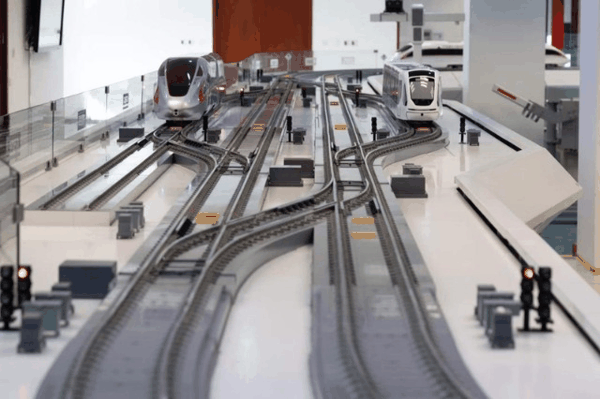 在 中国通号 的高速铁路信号系统动态测试实验室,有一条1:200的真实钢轨,火车模型依照信号灯有序通过。