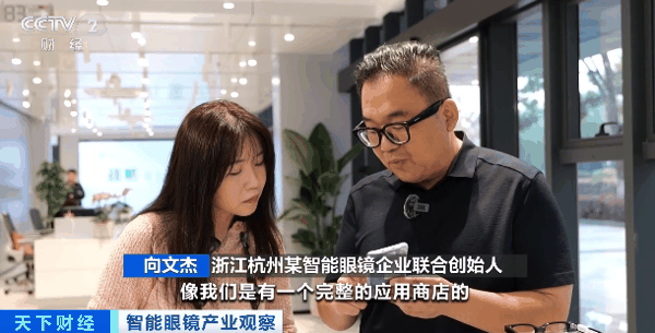 浙江杭州某智能眼镜企业联合创始人向文杰:我们有一个完整的应用商店,很多家庭有 智能家居 ,控制 智能家居 开灯、开电视、开 空调 ,用眼镜直接讲就可以。