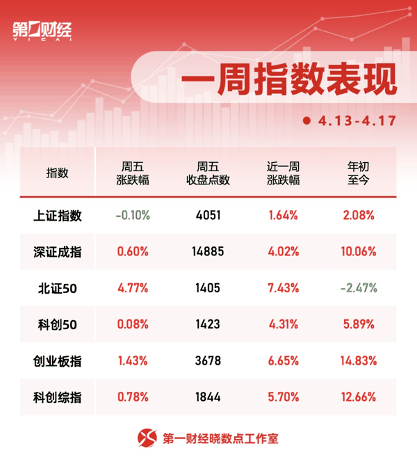 本周(4月13日至4月17日)A股指数均累计上涨,沪指本周累计涨1.64%,深成指涨4.02%,创业板指涨6.65%,科创综指涨5.70%。