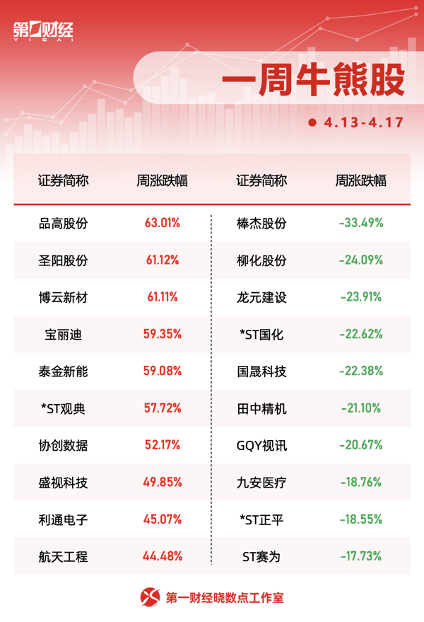 品高股份 本周涨幅居首,周涨幅达62.01%。 圣阳股份 、 博云新材 、 宝丽迪 周涨幅居前,分别为61.12%、61.11%、59.35%。