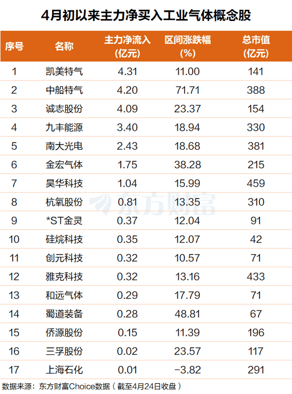 东方财富 Choice数据显示,自今年4月初以来,主力资金净买入一批 工业气体 概念股。