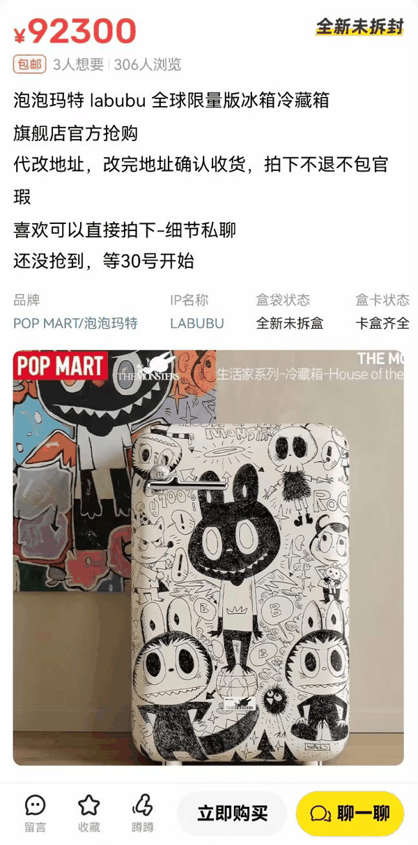 999台的限量规模,更像是一次市场测试——消费者愿意为一台“LABUBU牌的冰箱”支付多少溢价?而闲鱼上那个92300元的标价,最终是成交价,还是一场行为艺术,答案将在4月30日22点之后逐渐揭晓。