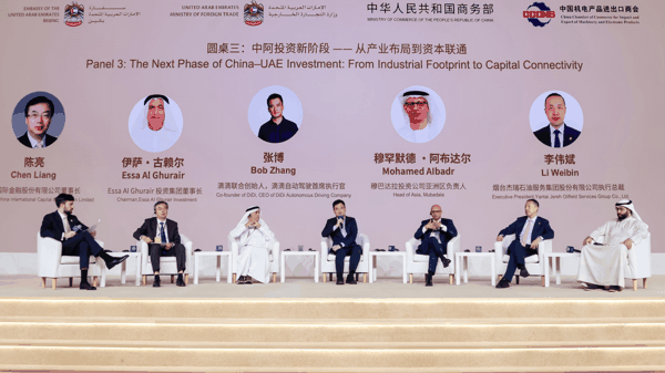 在中国阿联酋企业推介会圆桌论坛上,张博(左四)与中阿双方代表共同探讨合作新机遇