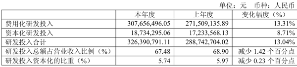 2025年全年,公司研发投入金额为3.26亿元,同比增长13.04%;研发投入占营业收入比例为67.48%,相比上年同期下降1.42个百分点。此外,公司全年研发投入资本化率为5.74%。