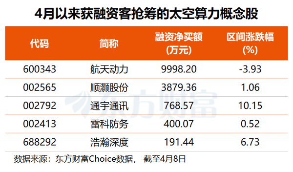 叠加资金角度看, 东方财富 Choice数据显示,4月以来,共5只太空算力概念股获得融资净买入, 航天动力 获杠杆资金加仓1亿元, 顺灏股份 获融资客抢筹0.39亿元,通宇通讯、 雷科防务 、 浩瀚深度 均获得百万元级别融资净买入。