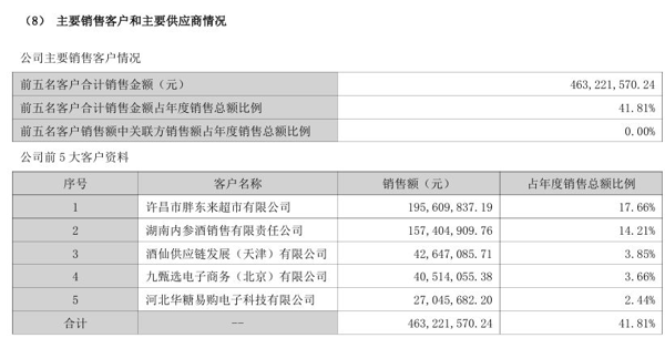 《每日经济新闻·将进酒》记者发现, 酒鬼酒 近年来首次在年报中披露前五大客户资料。其中,许昌市胖东来 超市 有限公司以全年销售1.96亿元居首,换句话说,短短合作半年时间,“酒鬼酒·自由爱”销售额近2亿元。