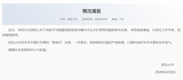 新京报讯 4月9日,西北大学发布情况通报:近日,学校关注到网上对于该校文学院教师贾某某涉嫌学术论文抄袭等问题的相关反映,学校高度重视,已成立工作专班,启动调查程序。