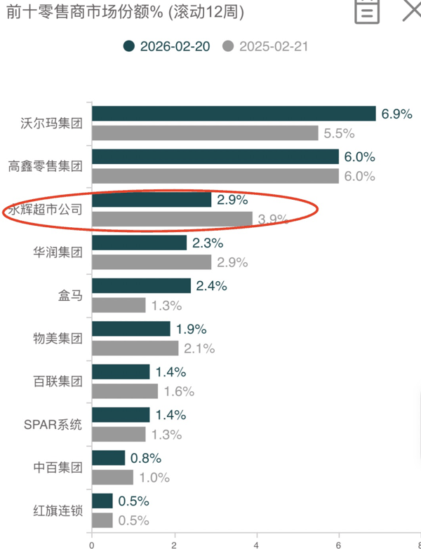 咨询公司Worldpanel消费者指数的数据显示,和2025年2月对比,在全国前十的零售商市场份额中, 永辉超市 排名第三,但其市场份额从去年2月的3.9%下滑到了今年2月的2.9%,而山姆所属的 沃尔玛 集团从去年2月的5.5%提升至今年2月的6.9%。