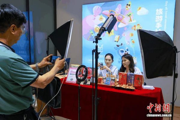 4月17日,在海南三亚德航FLY3跨境(零关税)体验城,主播正在进行跨境直播。中新网记者骆云飞摄