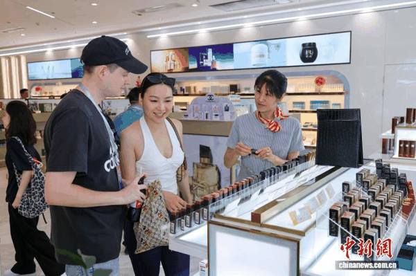 4月17日,在海南三亚德航FLY3跨境(零关税)体验城内,游人在此选购商品。中新网记者骆云飞摄