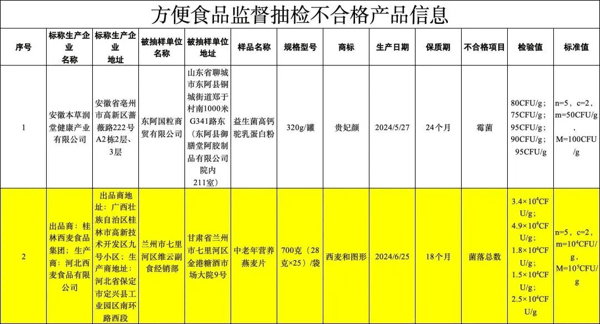 今年1月,国家市场监督管理总局披露一批不合格产品,其中西麦食品旗下、由河北西麦公司生产的“中老年营养燕麦片”被抽检出菌落总数不符合 食品安全 国家标准规定,5个样品检测值均已超出标准,存在明显的微生物污染风险。
