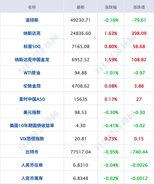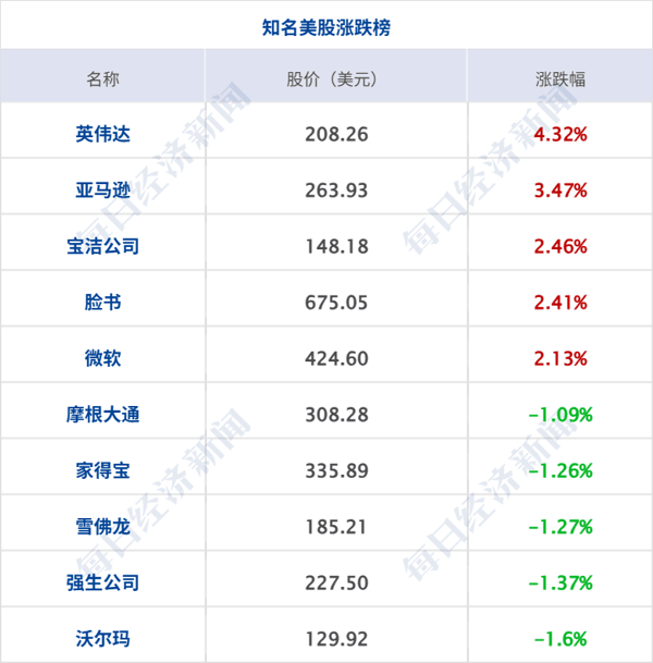 美股三大指数收盘涨跌不一,纳指涨1.63%,标普500指数涨0.8%,纳指、标普500指数双双再创新高,道指跌0.16% ;热门科技股普涨,费城 半导体 指数涨4.32%,本周累计上涨10%,本月迄今上涨38.5%, 英特尔 涨超23%, 英伟达 涨超4%,股价自10月以来首次收盘创纪录新高,市值重新站上5万亿美元, 亚马逊 涨超3%, 微软 、Meta涨超2%,谷歌涨超1%,Arm涨超14%,AMD涨超13%, 高通 涨超11%, 超微电脑 涨超8%, 美光科技 涨超3%。 中概股多数上涨, 纳斯达克 中国金龙指数涨1.59% , 禾赛 科技涨超6%, 百度 集团、 老虎证券 涨超5%,小鹏 汽车 、 世纪互联 涨逾4%, 金山云 跌超3%, 理想汽车 跌近3%。