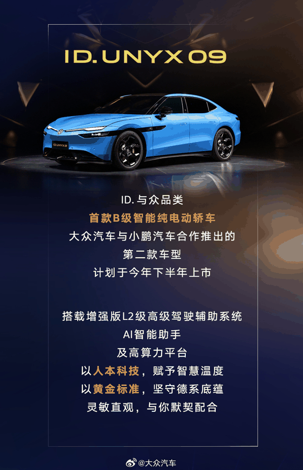 新车也是 ID.与众品类首款 B 级智能纯电轿车,是 大众汽车、小鹏汽车合作推出的第二款车型 ,计划下半年上市。