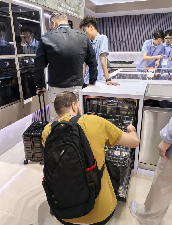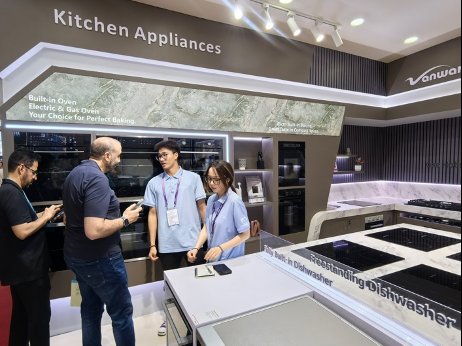 在厨房电器展区,万和面向特定市场推出45尺寸电烤箱升级产品,具备18种功能模式(10常规模式+8智能模式),实现全功能段智控。同时贴心考虑到出口海运成本,达成396台满柜装柜数,最大化利用柜体空间。灶具以硬核性能指标与差异化美学设计,回应不同消费群体对厨卫空间的多元期待,针对东欧及南美市场的细分需求,小尺寸系列化可适配小空间厨房;亲肤无印玻璃面板及纳米高分子无印涂层面板,触感温润且易清洁,搭配轻奢氛围灯,精准切入南美高端市场消费群体。此外,还贴心推出热效率高出意大利沙巴夫10%的稳燃灶。