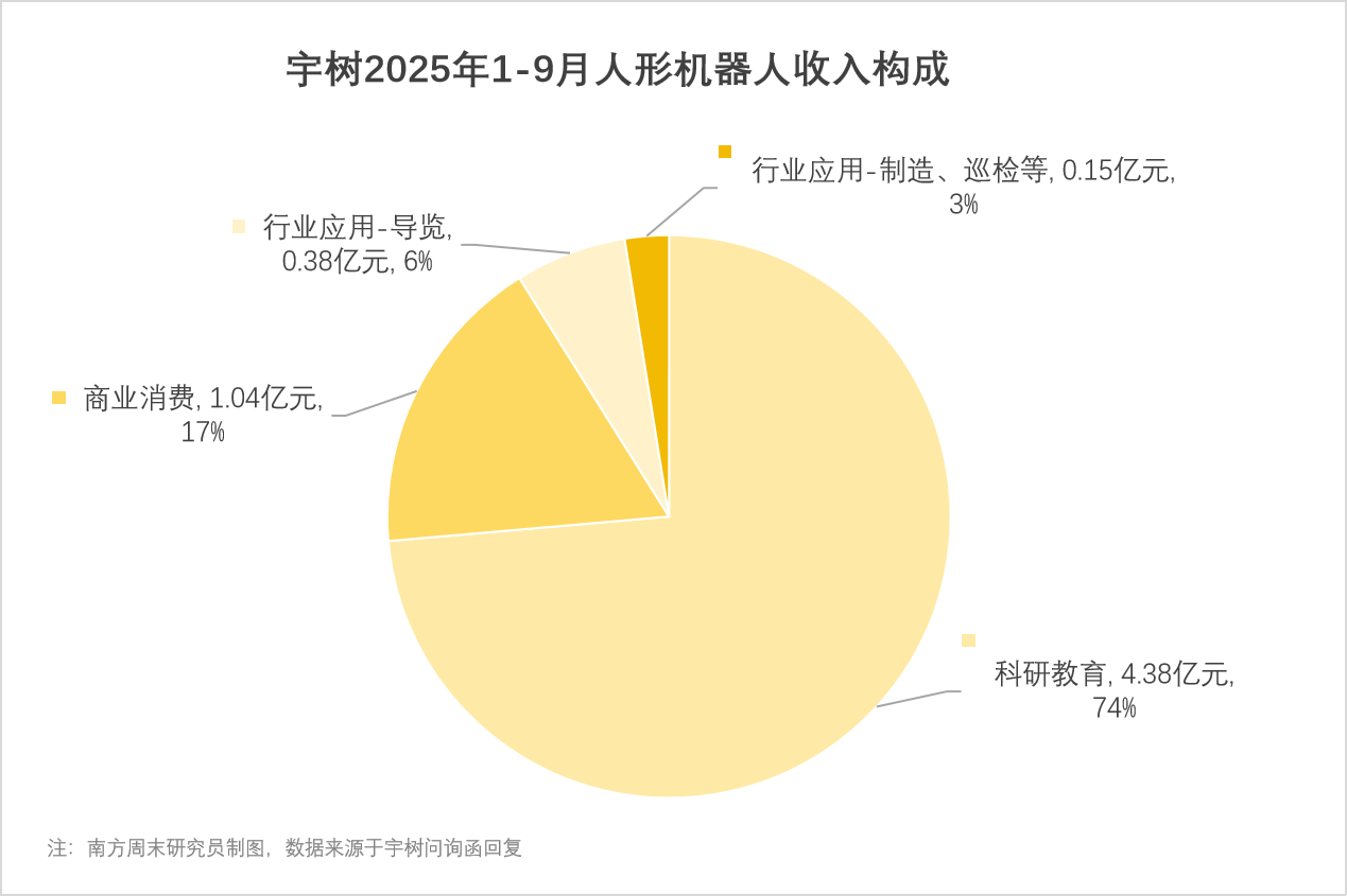 其中,宇树更聚焦本体,2025年1-9月,来自科研教育、商业消费的订单分别贡献了其人形机器人总营收的73.60%、17.39%,而行业应用仅占9.01%。这不足一成的份额,又以企业导览等智能化要求低的场景为主。 也就是说,其人形机器人绝大多数被卖给了高校做科研,或进入商业场景跳舞、迎宾;多数情况下,宇树做的是 “ 一锤子买卖 ” ,不提供配套开发服务。