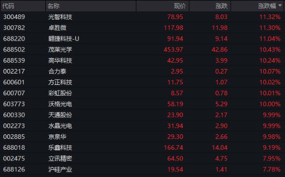TMT赛道上行,其中 电子 板块领涨,板块盘中涨幅超过1.7%,该板块内个股掀起涨停潮。 光智科技 、 卓胜微 、 翱捷科技-U 、 茂莱光学 、 高华科技 等多股盘中涨幅超过10%; 合力泰 、 方正科技 、 彩虹股份 、 沃格光电 、 天通股份 、 水晶光电 等多股涨停。