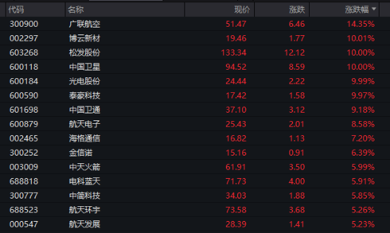 主要行业板块和赛道方面,若按照申万一级行业划分,国防 军工 板块领涨,板块盘中涨幅超过3%。 广联航空 涨幅超过14%, 博云新材 、 松发股份 、 中国卫星 、 光电股份 等多股涨停,另有10多只个股盘中涨幅超过5%。