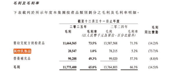 在主业承压的背景下,中国飞鹤加码成人乳制品作为第二增长曲线,2025年相关业务收入同比增长36.1%至20.6亿元,占比已超过一成。但该业务毛利率仅为1%,较2024年的5.2%明显下滑。