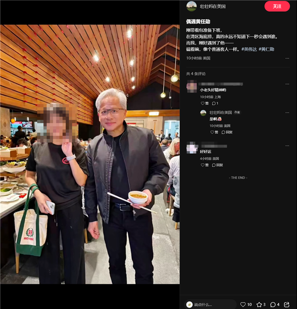 快科技4月16日消息,日前,多位网友在社交平台发帖称,在美国湾区一家海底捞偶遇英伟达CEO黄仁勋。