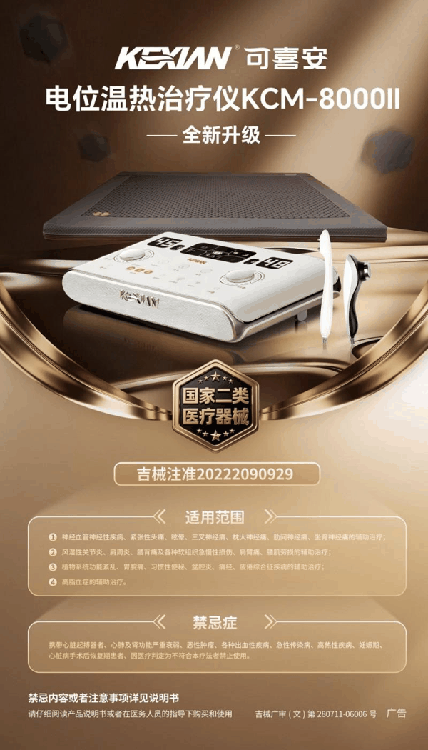 在健康中国战略深入推进与全民健康意识全面觉醒的时代背景下,家用医疗器械凭借便捷、高效、安全的优势,成为现代家庭健康管理的核心配置。作为深耕健康产业22年的民族品牌,可喜安始终坚守“以科技守护健康”的初心,聚焦大众居家理疗需求,持续推动技术创新与产品迭代。近日,可喜安第五代电位温热治疗仪KCM-8000II正式上市,凭借国家二类医疗器械资质、核心专利技术、全方位功能升级与完善的服务体系,为万千家庭带来专业化、个性化、智能化的居家辅助理疗解决方案,重新定义家庭健康理疗新标杆。