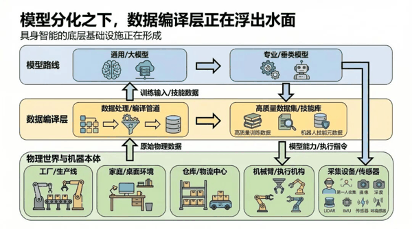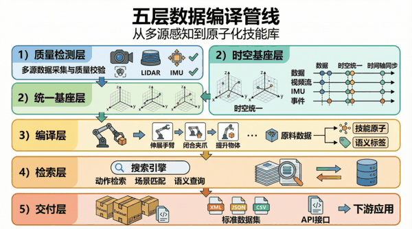 为此,他们提出了「 数据编译 」的概念。所谓数据编译,就是为物理世界那些高熵、异步、多模态的原始数据,建立一套自动化「精炼管线」—— 去噪、对齐、拆解为「技能原子」,并打上可追溯的语义标签,让算法真正读懂物理规律与动作意图,最后凝结为模型。