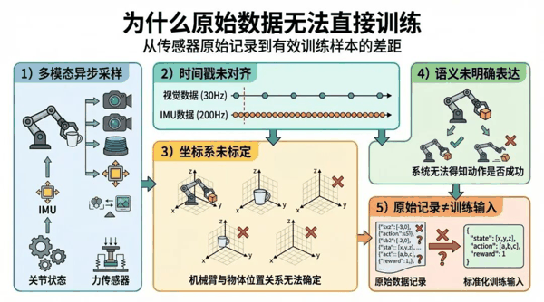 首先,机器人数据通常具有 多模态、强耦合、异步采样 等特点。当手伸向杯子的那一瞬间,摄像头可能以 30Hz 记录画面,IMU 以 200Hz 甚至更高频率输出惯导信息,关节编码器也运行在各自的采样频率与时钟体系下。对于理想中的训练输入,在时间维度上,需要完成多传感器时间戳同步;在空间维度上,则要完成视觉、末端位姿、力觉 / 触觉与关节状态之间的坐标系标定与对齐。否则就会出现「手已经摸到杯子,视觉却显示还有五厘米」的诡异错位。将这种时空错配输入模型,往往会诱导其学习到错误的感知 — 动作映射。