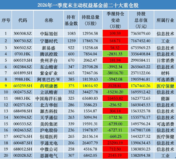 中际旭创蝉联主动权益基金头号重仓股,药明康德顶替寒武纪跻身前十