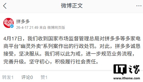 IT之家 4 月 17 日消息,市场监管总局今日通报,针对部分电商平台存在“幽灵外卖”问题,即商家利用虚假证照、套证、一店多开等方式违规开展外卖业务,总局对拼多多等多家电商平台进行了立案调查并作出行政处罚,并处以罚没款共计 35.97 亿元。