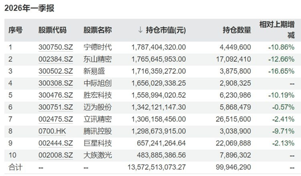 今日,睿远基金旗下产品披露了2026年一季报,记者注意到,傅鹏博管理的睿远成长价值,在一季度减持了 新易盛 、 东山精密 、 胜宏科技 等多只CPO板块个股,不过 中际旭创 进入前十大,持仓大方向依然围绕 PCB 、芯片和光 通信 。