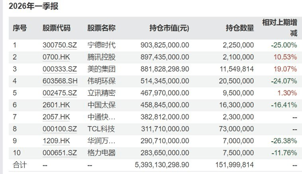 在前十大重仓股方面,比较明显的变化是 中国平安 、 中国太平 退出前十大, 中通快递-W 、 TCL科技 新进前十大。