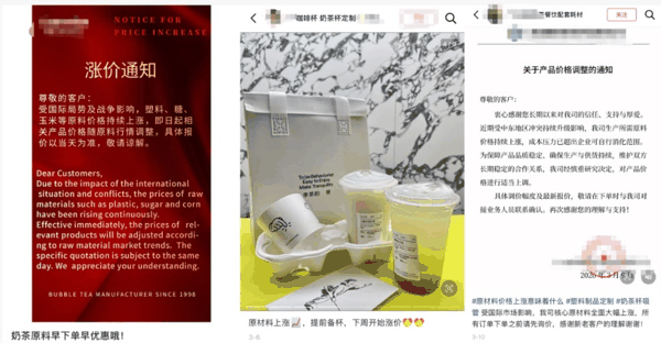 3月以来,多家茶饮原料供应商发布公告和通知称,受国际局势影响,奶茶杯、吸管等包材类产品价格迎来上调。