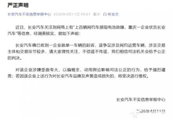 近期,“上百辆网约车频现电池故障,重庆一企业状告长安汽车”的消息在网上引起了广泛关注,长安汽车也成为了舆论焦点。4月11日,长安汽车对此事作出了回应。