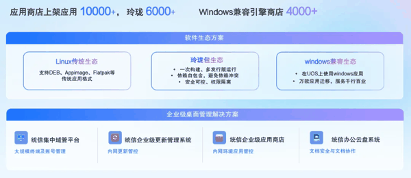 软件层面, 应用商店上架应用超过 1 万款 ,玲珑格式包超过 6000 款,Windows 兼容引擎商店提供超过 4000 款 Windows 应用,满足日常办公需求。
