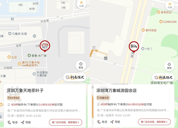 界面新闻查询茶颜悦色小程序看到,截至今日上午11点20分左右,深圳万象天地店有163杯饮品在制作中,下单预计2小时43分钟后可取;深圳湾万象城店则多达403杯在制作中,下单预计6小时43分钟后才能拿到。
