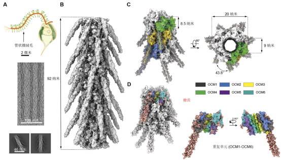 冷冻电镜分析揭示金藻管状微绒毛表面存在的大量复杂糖质及其近原子分辨率三维结构。A.金藻表面的管状微绒毛。上图:金藻卡通示意图,以及其长鞭毛(橙色粗线)表面覆盖的微绒毛(浅绿色细线)。中图:冷冻电镜拍摄到的管状微绒毛的原始照片。下图:图像初步处理过的二维分类。B.管状微绒毛的冷冻电镜三维重构图。C.根据冷冻电镜密度图搭建的微绒毛结构模型。D.微绒毛表面覆盖大量复杂糖质(以红白球示意)。深圳医学科学院供图