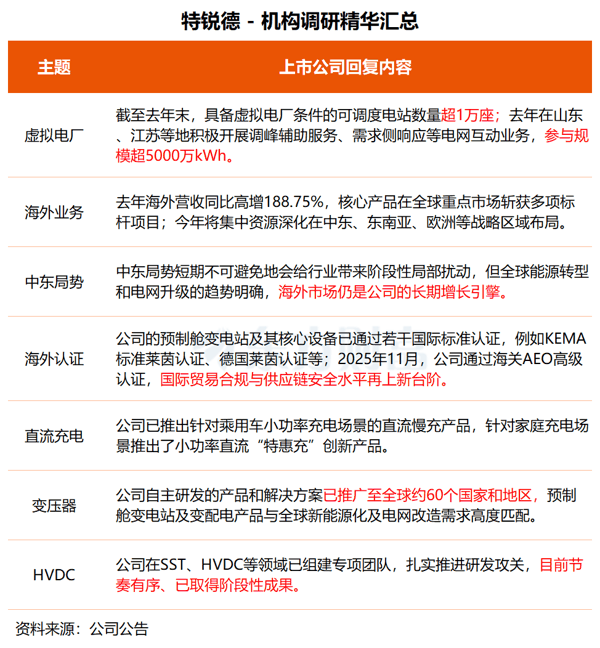 在调研中, 特锐德 表示,公司自主研发的产品和解决方案已推广至全球约60个国家和地区,公司预制舱变电站及变配电核心产品与全球 新能源 化及电网改造需求高度匹配。