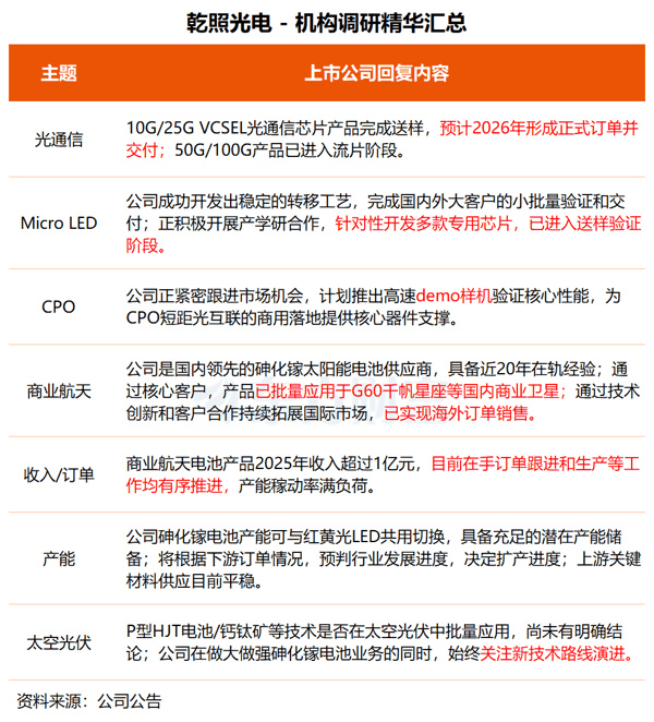 另据介绍,2025年,公司 商业航天 电池 产品收入超过1亿元,目前在手订单跟进和生产等工作均有序推进,产能稼动率满负荷;目前暂没有钙钛矿 电池 相关布局。公司将积极把握商业航天市场机遇,优化砷化镓电池生产效率。
