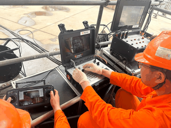 (镇海炼化基地二期现场,技术人员操控 面板 观察 机器人 在球罐内作业情况,柳宁馨/摄)