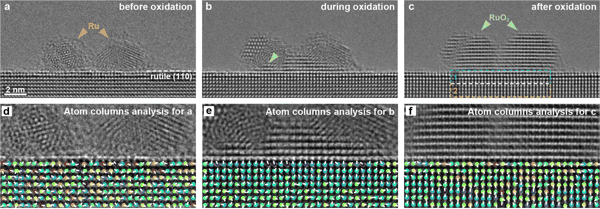截至目前,科学家对催化剂表面的溢流行为已有深入认识,但关于负载型金属催化剂的体相,特别是金属/载体界面是否存在类似的溢流过程,以及其如何影响催化反应仍是未解之谜。对此,研究团队聚焦于高性能负载型钌基催化剂的研发,利用原子分辨环境透射电镜,从原子尺度原位解析了金红石型二氧化钛中钌单颗粒的氧化机制,并首次在该过程中观测到体相氧溢流,证实了载体中的晶格氧以空位介导的方式通过界面输运至金属颗粒。与此同时,团队还建立了皮米精度原子应变矢量分析方法,高分辨定量解析了氧溢流的行为,并追踪到界面持续氧输运所引发的载体局域晶格动态应变,进而揭示了金属/载体界面对体相氧溢流的调控作用,阐明了界面结构适配是体相氧溢流通道畅通的保障。这种机制被证实广泛存在于氧化物相低晶格失配度的金属/载体界面催化剂体系中,并在催化反应中发挥关键作用。
