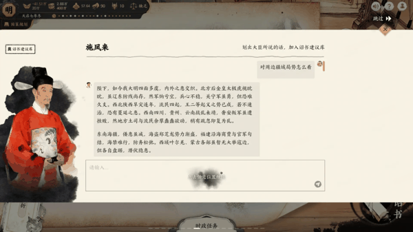 千问在满足玩家的天马行空之外,也会冷酷地还原真实世界的混沌与复杂: 比如,玩家为了抵御小冰河期推广耐寒作物,种子也可能遭官僚盘剥引发新的危机;为抵御外敌大力整军,也可能出现加税失民心、裁冗催生起义。